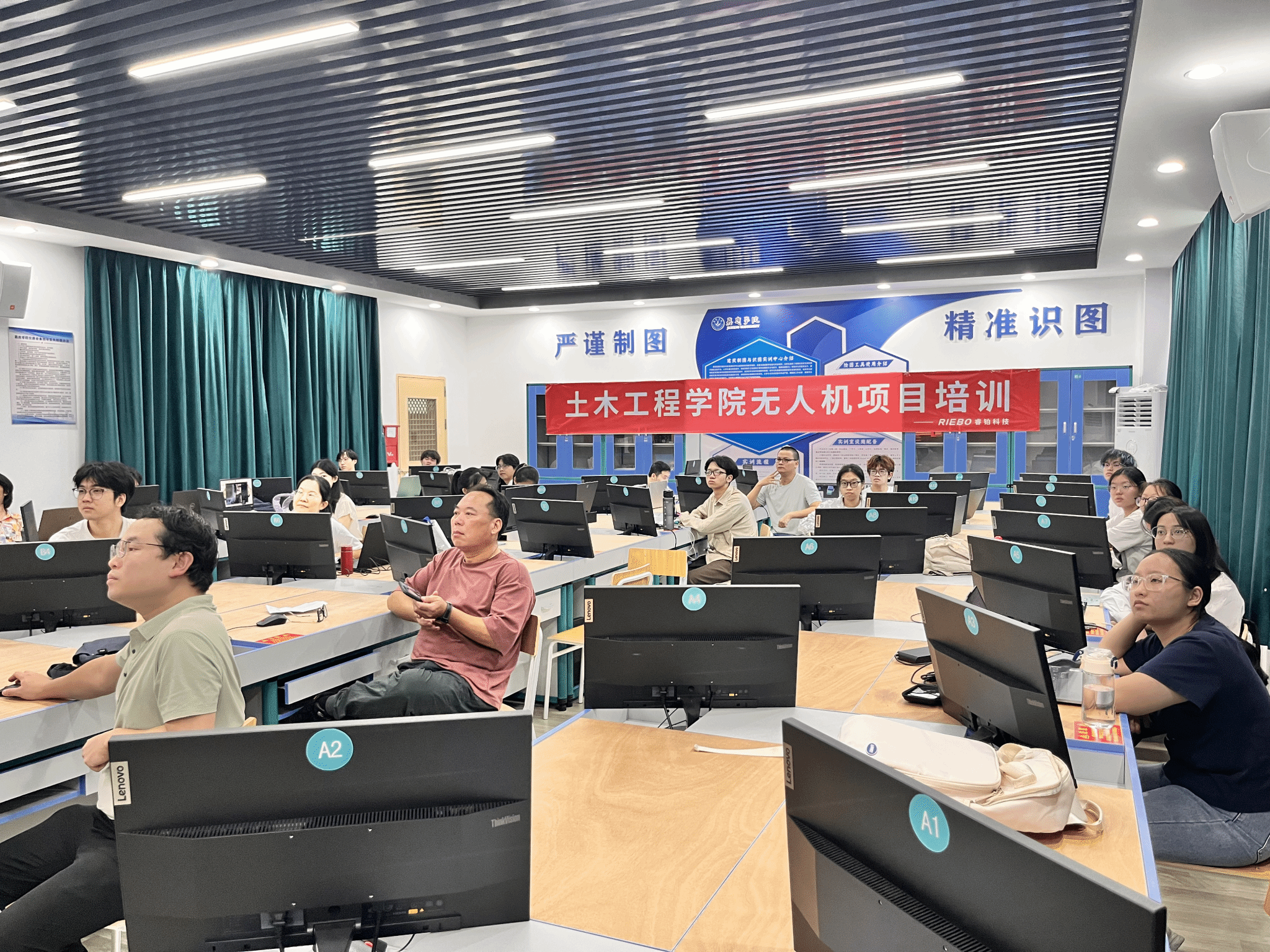 培训首日聚焦理论奠基,培训讲师围绕基础测绘知识体系展开,从无人机航测原理、不同地形下的航线设计策略,到数据采集软件的参数设置、误差控制方法,进行细致拆解。10月26日上午进入实践阶段,教师代表与学生代表依次上机实操,在专业指导下完成无人机起飞校准、航线规划执行、多角度数据采集等流程。下午则转入内业处理环节,通过专业软件对采集的影像数据进行拼接、建模,最终完成三维地形模型构建与工程图纸绘制,实现“从空中数据到地面成果”的全流程落地。