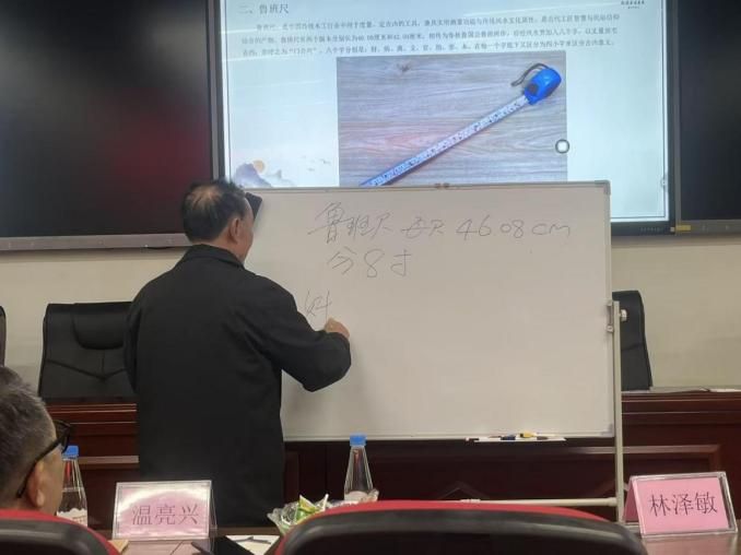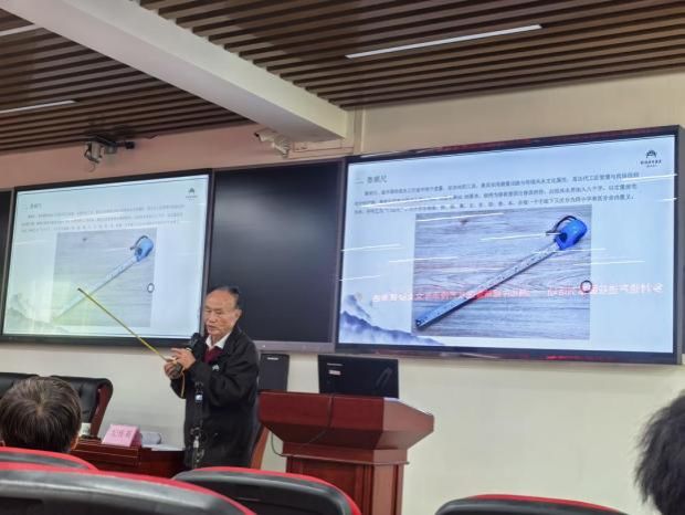 讲座中,纪传英先生系统阐释了潮汕古建筑的文化基因与营造精髓。他从 “驷马拖车”“四点金”“下山虎” 等经典建筑格局切入,详解以夯土墙、石木结构为核心的建造体系,以及嵌瓷、木雕、石雕等独具地域特色的装饰工艺。现场演示的鲁班尺运用技艺,让师生直观感受这一兼具测量功能与风水文化属性的传统工具魅力,体会古代工匠将实用智慧与民俗信仰融为一体的匠心巧思(见图1-4)。