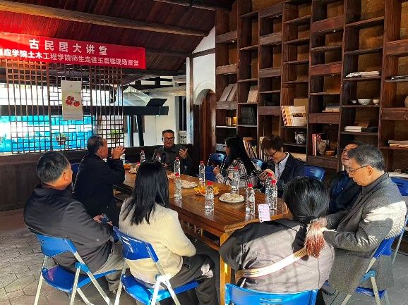 本次活动由土木工程学院建筑学专业负责人董作荣教授带队,学科带头人徐伟陵副教授、邱振原博士、陈明霞博士(客家建筑研究所所长)及建筑学2204班全体学生共同参与。广东纪传英古建筑营造有限公司纪传英董事长、纪雪飞副总经理一行 5 人,梅州古民居研究会温亮兴会长、姚若行副会长亲临现场,政企校三方齐聚古建之下,共探传统建筑的保护路径与当代价值转化。