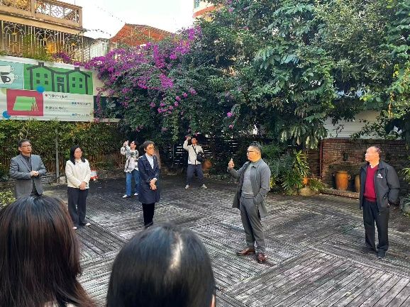 在温亮兴会长、姚若行副会长的引导下,师生们实地探访这座始建于 1923 年的客家传统建筑,通过聆听讲解、互动交流,深入了解其 “五开间三堂一横” 的走马楼形制、中西合璧的建筑特色与亟待活化的现实需求。作为玉庭楼修缮项目核心主导者,深耕古建修缮领域二十余载的温亮兴先生,在现场为全体人员详细介绍建筑沿革与修缮历程(见图1-4)。