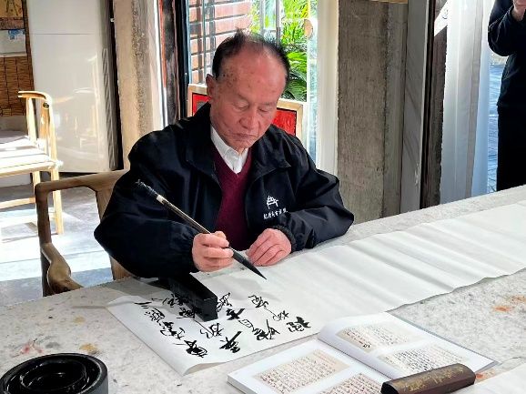在实地探访后,教师团队与企业、研究会嘉宾围绕“古民居现代活化路径”“修缮技术创新”等核心议题展开座谈,思想碰撞间为学生搭建起理论与实践对接的桥梁。学生们分组开展建筑测绘、影像记录、问卷访谈,手持测量工具精准记录开间、进深、构件尺寸等数据,将课堂所学融入真实工程场景,为毕业设计积累宝贵案例。活动尾声,纪传英先生现场挥毫泼墨,创作“物不迁,安于室”书法作品,以笔墨寄寓古建保护理念,为此次研学活动增添浓厚文化气息(见图5-6)。