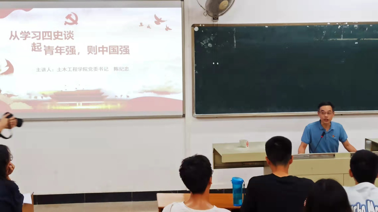 陈纪忠书记以《青年强,则中国强》为题,从戊戌变法失败产生的影响引出梁启超撰写的《少年中国说》,进而引出本次主题,从回顾我们党的百年辉煌征程,指出一代又一代的青年在我们党的带领下奋斗在祖国各个岗位,奉献出自己的青春和才华。最后希望同学们葆有初心,勇担使命,为实现民族复兴奉献青春力量。