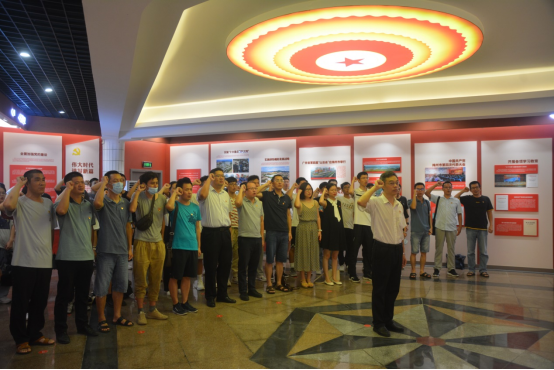 全体党员首先来到展览内容前,依次参观了浮雕墙、“开天辟地 春雷激荡”、“创建苏区 红旗漫卷”、“同仇敌忾 抗日救亡”、“解放烽火 照亮梅州”、“励精图治 百废俱兴”、“艰辛探索 曲折发展”、“改革开放 扬帆启航”、“跨越世纪 特色发展”、“科学发展 绿色崛起”、“伟大时代 谱写新篇”等十一个单元展区。参观结束后,全体师生党员面向党旗,由学院党委书记陈纪忠同志带领全体党员重温入党誓词,铿锵有力的宣誓声响彻展厅,久久回荡。