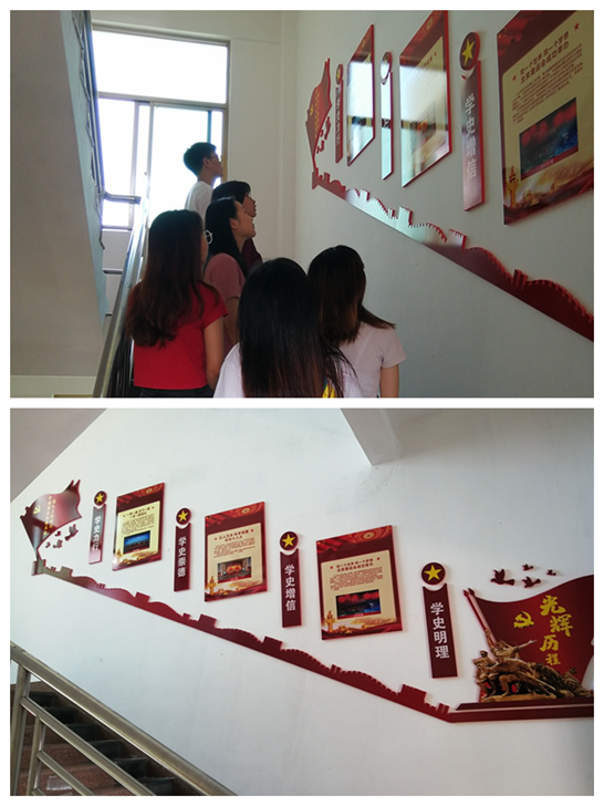 为了更好地推动党史学习教育入耳、入脑、入心、入行,我校土木工程学院党委联合地理科学与旅游学院党委,通过走访调研,创新思路,在公颜实训大楼1至6楼楼梯侧的墙面位置,设立党史宣传长廊,通过文字、彩图和指示板交互展示中国共产党成立100周年中的30件重大事件,突出我党为人民为民族不懈奋斗的历史,再现我党百年辉煌发展史。从而将普通的楼道秒变为党史学习教育和红色革命传承的重要阵地,方便更多师生,在行走间就可以学习党史、研究党史、铭记党史,打通党史学习教育“最后一米”。