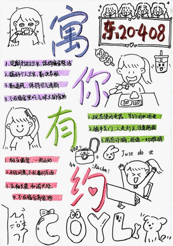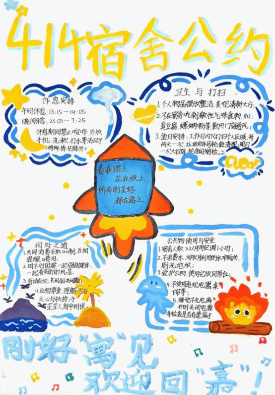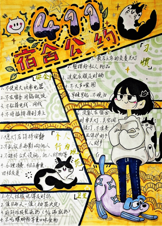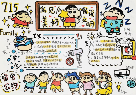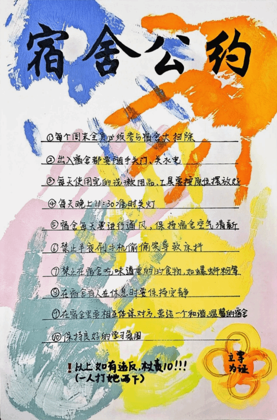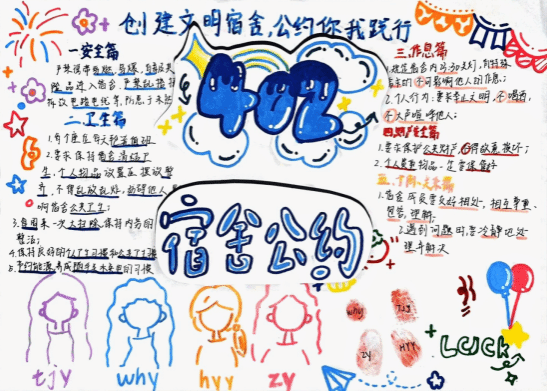 本次活动中,各参赛队伍制作的宿舍公约设计精美、内容丰富。现将部分获奖的优秀宿舍公约展示如下: