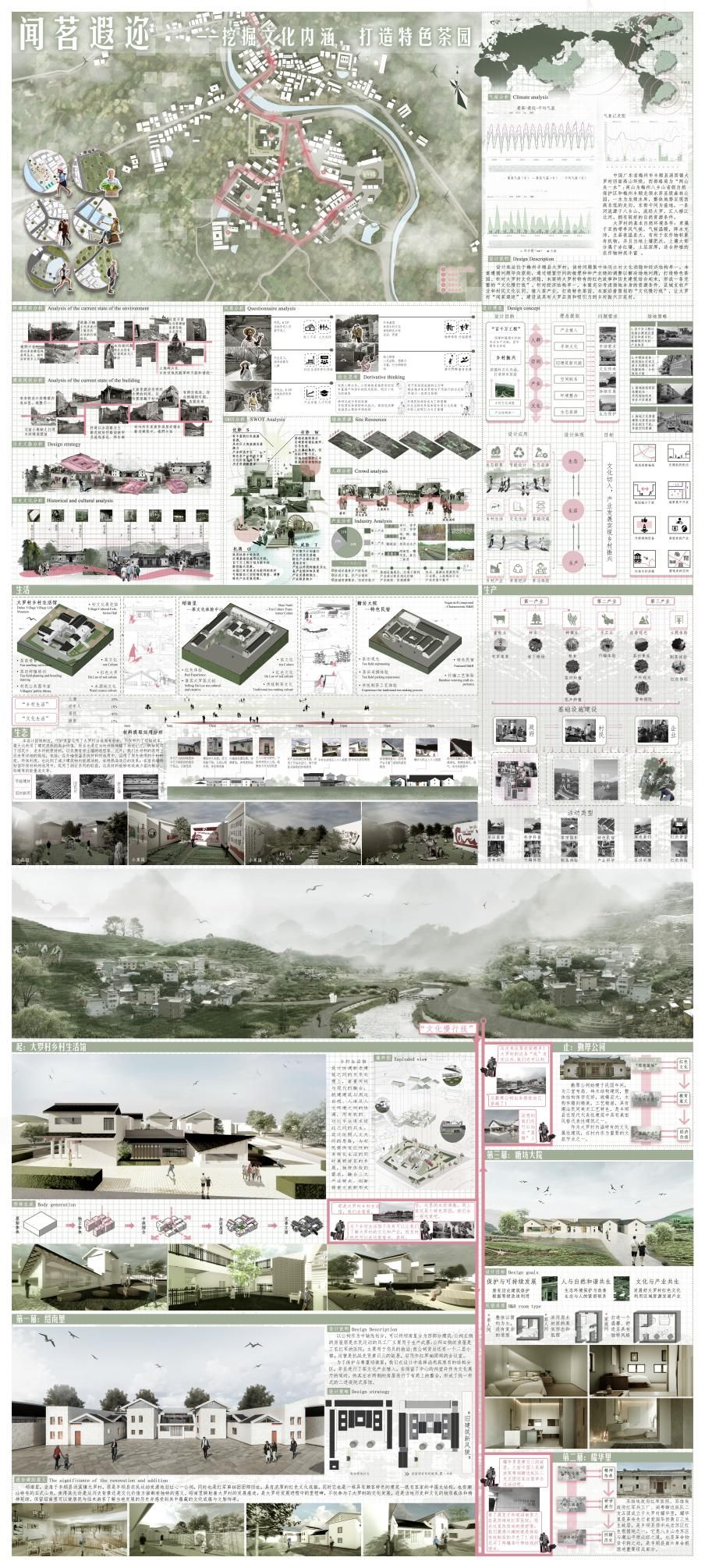 三等奖作品《闻茗遐迩------挖掘文化内涵,打造特色茶园》深入调研大罗村的现存问题与文化底蕴,遵循“问题导向”原则,将当地红色故事与历史建筑资源巧妙融合,设计出一条完整的“文化慢行线”。作品以茶产业为核心,通过挖掘大罗村茶文化内涵,打造集茶园观光、文化体验、红色教育于一体的特色乡村品牌。该设计不仅体现了“文化+产业”的双重赋能,还与“百千万工程”中“打造乡村特色产业示范带”的目标高度契合,为县域文旅融合发展提供了可推广的范例。