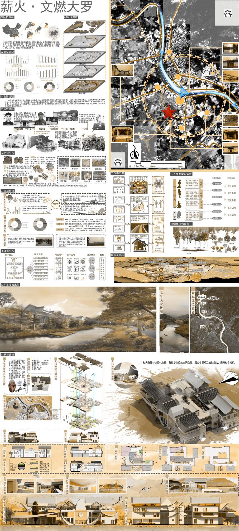 优胜奖作品《薪火·文燃大罗》以“农文旅融合”为核心理念,围绕大罗村的文化传承与生态保护展开规划设计。作品提出以“文化体验中心”为核心节点,串联全村文旅资源,构建“大节点联动小节点”的产业网络。通过弘扬客家优秀传统文化、贯彻“绿水青山就是金山银山”理念,作品将生态农业、文化体验与旅游观光深度融合,助力大罗村建设成为“百千万工程”中“绿美宜居、特色鲜明”的典型村落,为区域经济高质量发展贡献青年智慧。