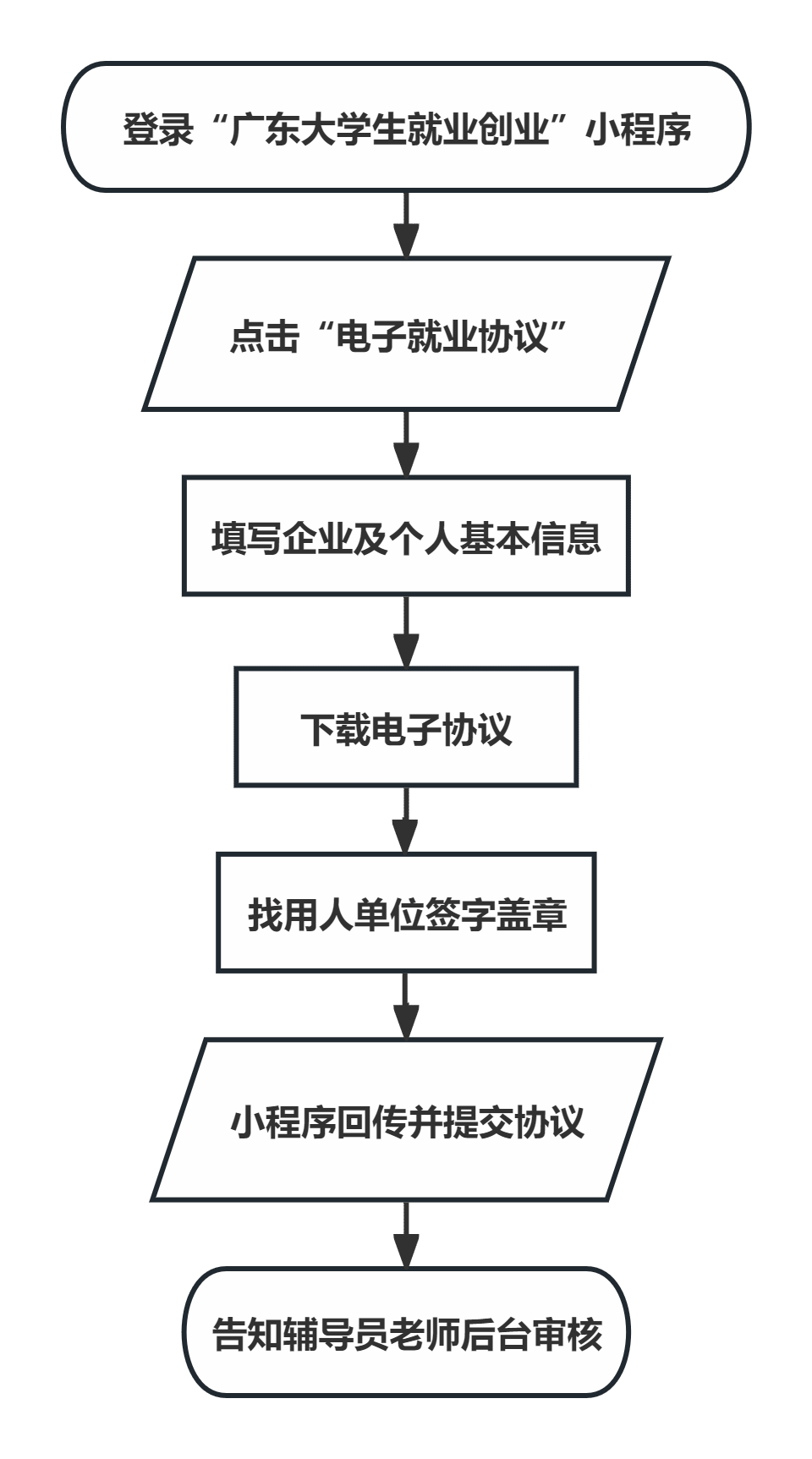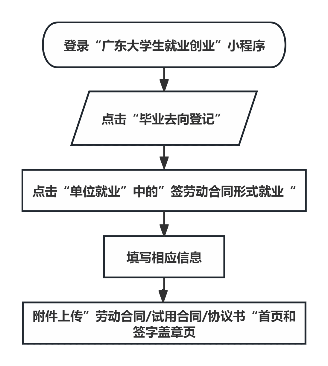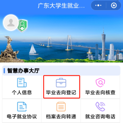 已完成“广东大学生就业创业”小程序“电子就业协议”签订的毕业生,无需再填报毕业去向信息,系统将自动同步至毕业去向登记处。