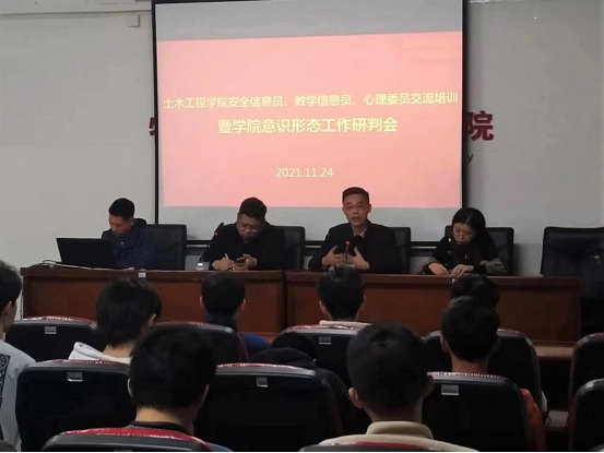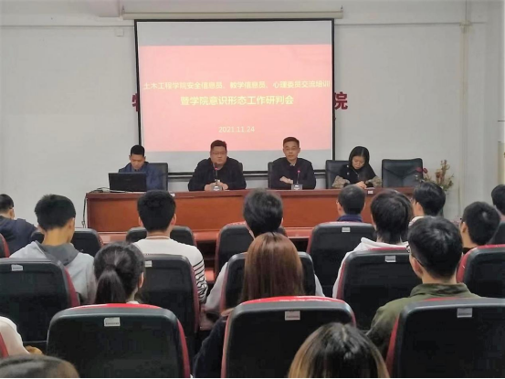 为了进一步了解我院学生在校的学习和生活情况,学生心理健康状况、以及学院教学情况,推进我院学生工作稳定有序开展,同时,为更好地做好学院意识形态工作,11月24日下午,土木工程学院在何侨生大楼101会议室召开了学院安全信息员、教学信息员、心理委员交流培训及意识形态工作研判会。土木工程学院党委书记陈纪忠、副书记张敏、学工办主任李丽敏、辅导员李元贵及学院安全信息员、教学信息员、心理委员近40人参与了本次会议。