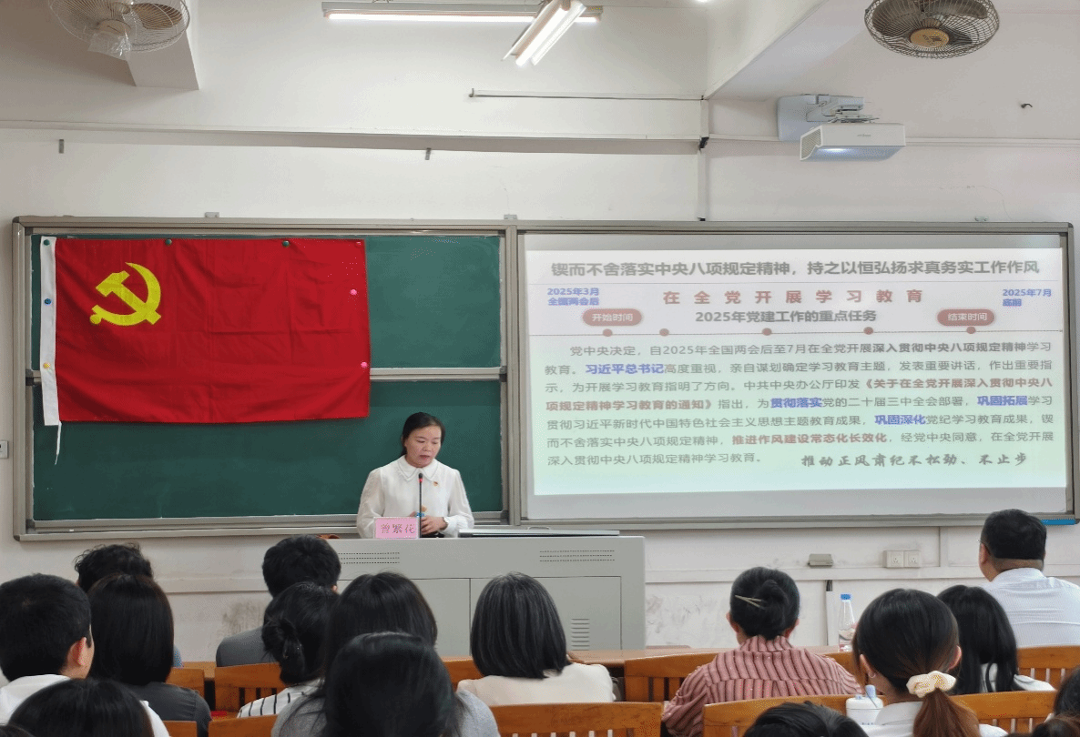 为进一步推进深入贯彻中央八项规定精神学习教育,加强全院师生党员的纪律意识,强化作风建设,我院于5月21日下午在公颜实训大楼C508室组织开展了学习教育活动。马克思主义学院副教授曾繁花以“锲而不舍落实中央八项规定精神,持之以恒弘扬求真务实工作作风”为主题讲授专题党课,共计60余人参加了此次党课学习。